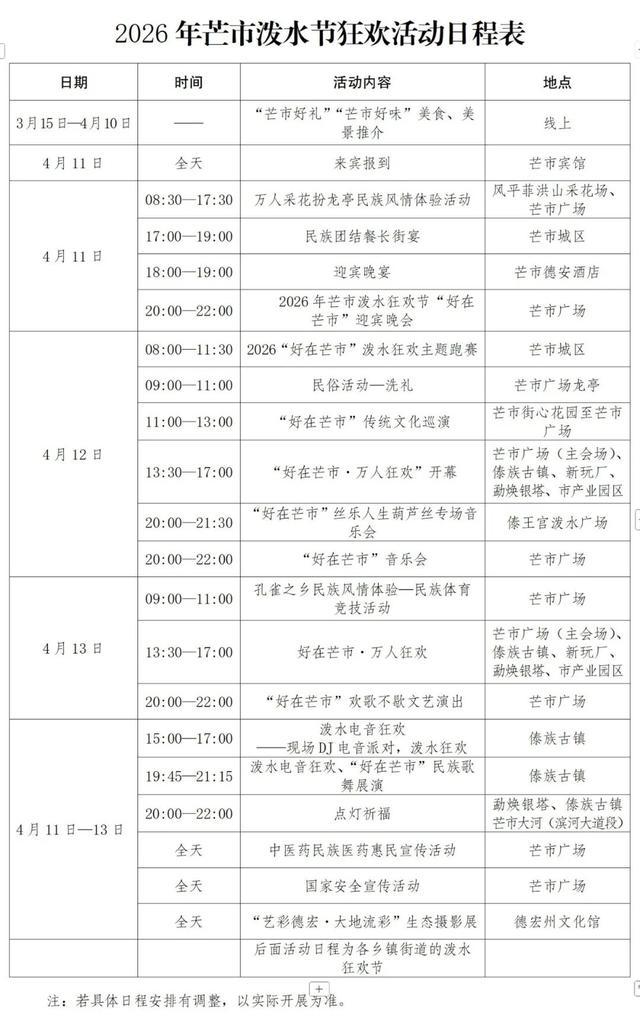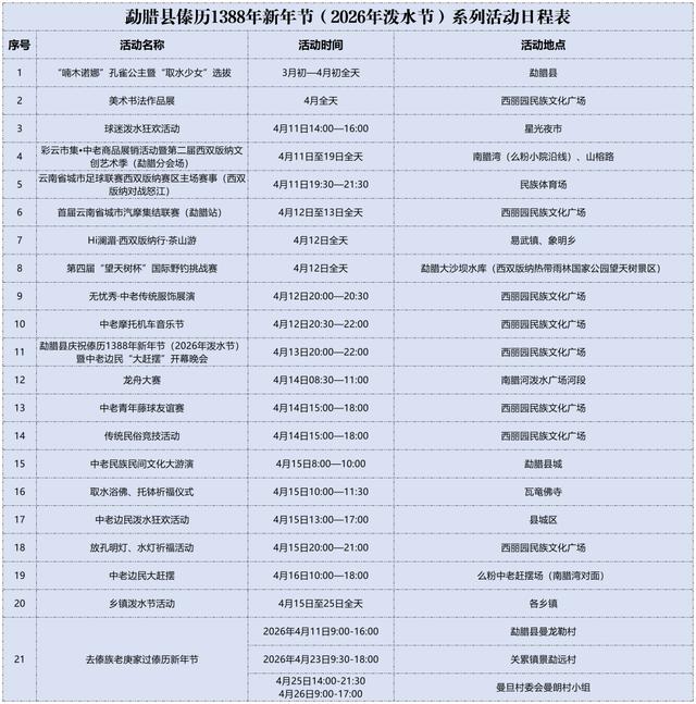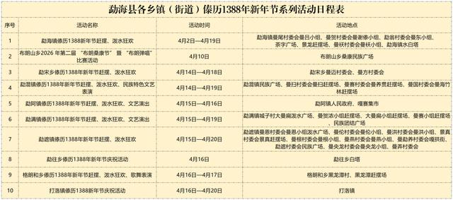 民族节日传统文化体验:4月15日沙河乡,4月16日勐勐镇,4月17日勐库镇,4月18日沙河乡。地点:沙河乡允俸社区忙孝一组、景亢组,勐勐镇闷乐村闷乐组,勐库镇城子社区城子自然村。内容:百家宴活动。