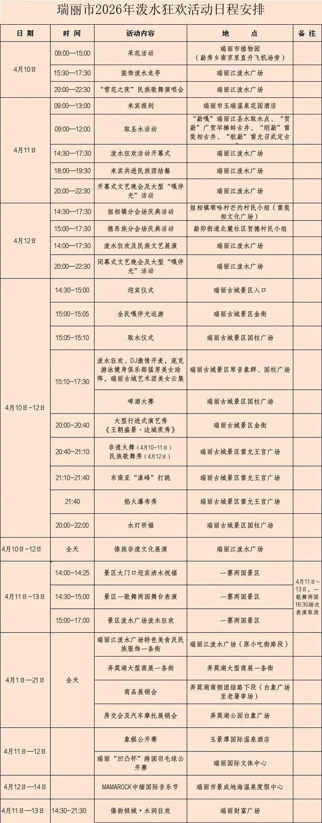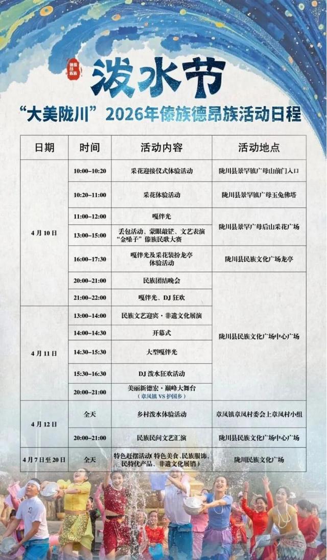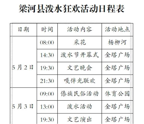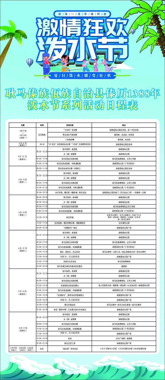 团拜暨万人泼水狂欢活动:4月15日11:00—17:00,县民族文化广场。