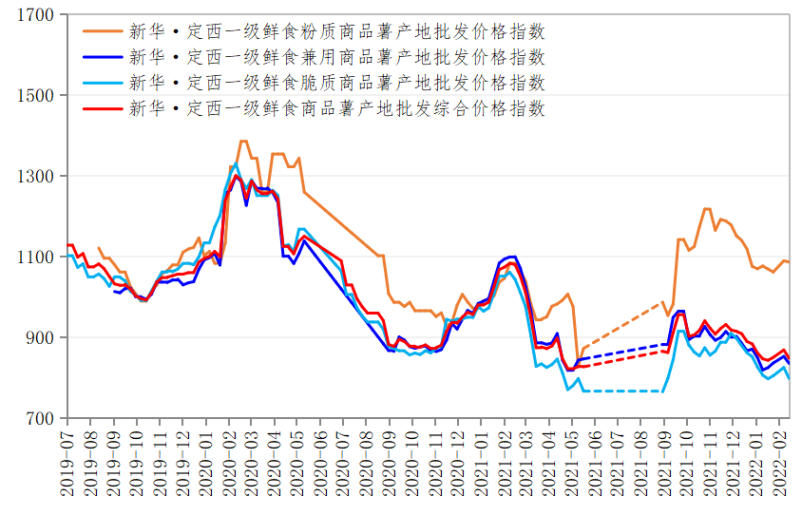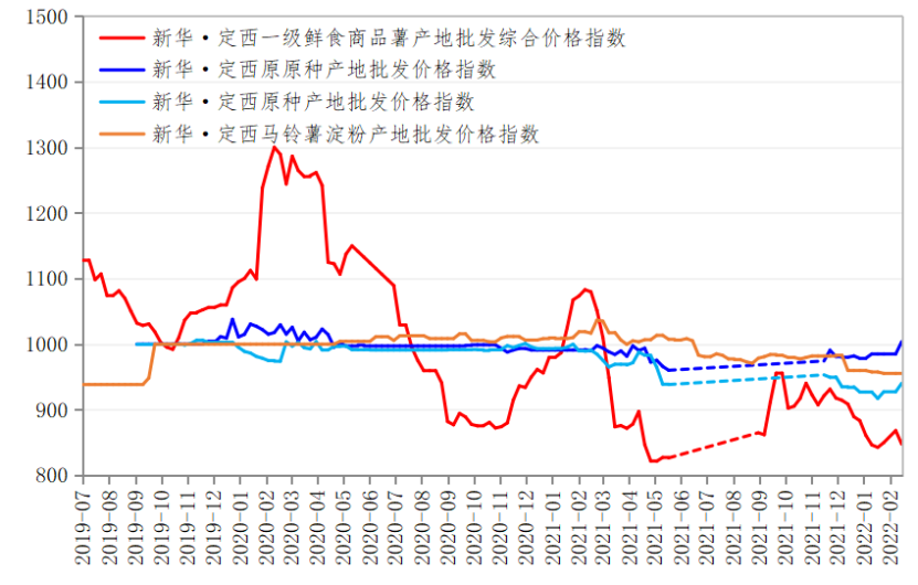 本期定西商品薯价格小幅回落,原种和原原种价格上涨,马铃薯淀粉价格平稳运行。截至2022年2月18日,新华·定西一级鲜食商品薯产地批发综合价格指数报847.71点,环比下跌2.37%,同比(2021年2月19日,下同)下跌21.49%;新华·定西原原种产地批发价格指数报1003.75点,环比上涨1.90%,同比上涨1.41%;新华·定西原种产地批发价格指数报940.29点,环比上涨1.38%,同比下跌5.09%;新华·定西马铃薯淀粉产地批发价格指数报955.41点,环比持平,同比下跌6.04%。