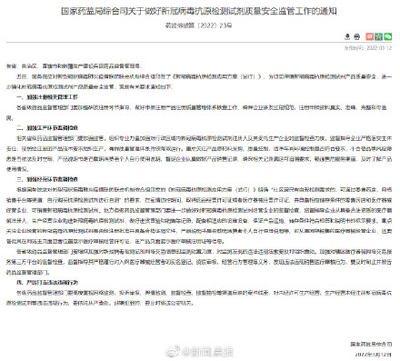 国家药监局12日发布关于做好新冠病毒抗原检测试剂质量安全监管工作的通知。 近日,国务院应对新型冠状病毒肺炎疫情联防联控机制综合组印发了《新冠病毒抗原检测应用方案(试行)》。为切实保障新冠病毒抗原检测试剂产品质量安全,进一步强化新冠病毒抗原检测试剂产品质量安全监管。