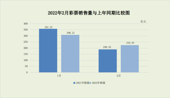据财政部3月30日消息,财政部发布2022年2月份全国彩票销售情况,数据显示,2月份,全国共销售彩票224.81亿元,同比增加35.26亿元,增长18.6%。其中,福利彩票机构销售93.82亿元,同比增加15.41亿元,增长19.7%;体育彩票机构销售130.99亿元,同比增加19.85亿元,增长17.9%。