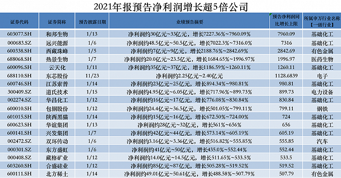 此外,上周披露业绩预告的高增长公司中,基础化工领域的藏格矿业(000408.SZ)、华谊集团(600623.SH)、合盛硅业(603260.SH)同样成为业绩预告“先锋队”,预计2021年净利润最高增长分别为533.5%、656%、519.52%;钢铁行业的包钢股份(600010.SH)、有色金属领域的北方稀土(600111.SH)也分别实现最高799.11%、507.79%的业绩增长。