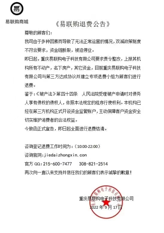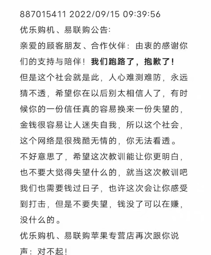 此外,网传的一份优乐购机和易联购发布的联合跑路声明称:“我们跑路了,抱歉了!就当这次教训吧……钱没了可以在赚,没什么的”引起网友热议,也被众多大V转发。记者发现,该声明有多处错别字,真假存疑。随后,网络再次传出两份易联购的声明。