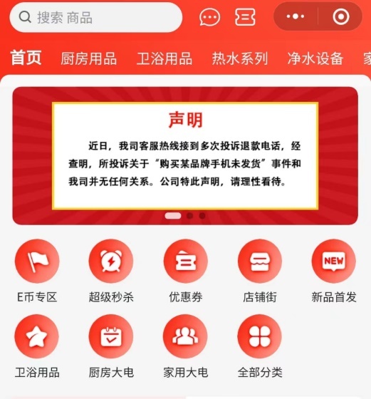 与此同时,与易联购同名的小程序也受到不同程度波及。目前,“易联购供应链”小程序首页发布声明称,近日客服热线接到多次投诉退款电话,经查明,所投诉关于“购买某品牌手机未发货”事件与公司并无任何关系。